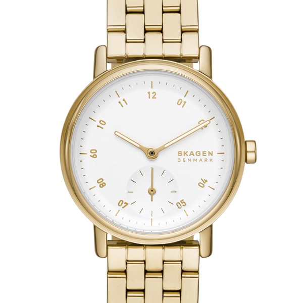 32mm径ケースに二針サブセコンドムーブメントを搭載した、KUPPEL LILLE。ホワイトのサンドブラストダイヤルに、イエローゴールドトーンのステンレススチールブレスレットを組み合わせました。ウォッチストラップは付け替え可能です。