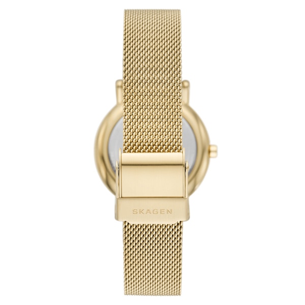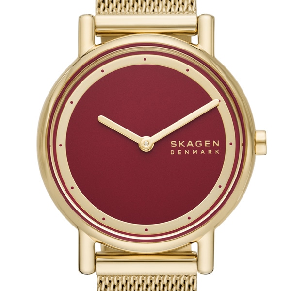 サンドブラスト仕上げのクランベリーのダイヤルに、ゴールドトーンのステンレススチール製メッシュストラップを組み合わせました。ウォッチストラップは付け替え可能です。