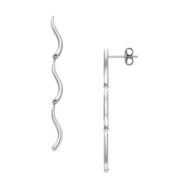 ウェーブのラインにデザインした、シルバートーンのステンレススチール製ロングドロップピアス。ポストタイプ。