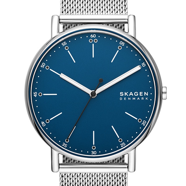 40mm径のケースに三針ムーブメントを搭載したSIGNATUR。ブルーのマットダイヤルに、シルバートーンのステンレススチール製メッシュストラップを組み合わせました。ウォッチストラップは付け替え可能です。