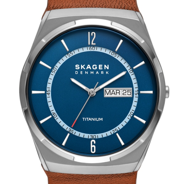 40mm径のケースにデイデイト表示付き三針ムーブメントを搭載したMELBYE TITANIUM。
