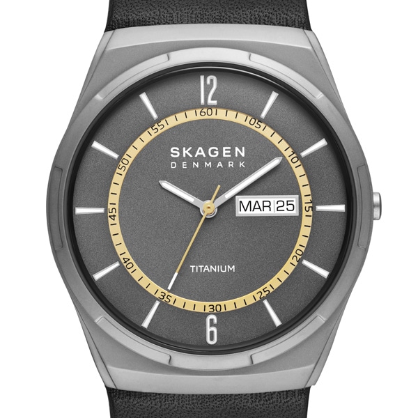 40mm径のケースにデイデイト表示付き三針ムーブメントを搭載したMELBYE TITANIUM。
