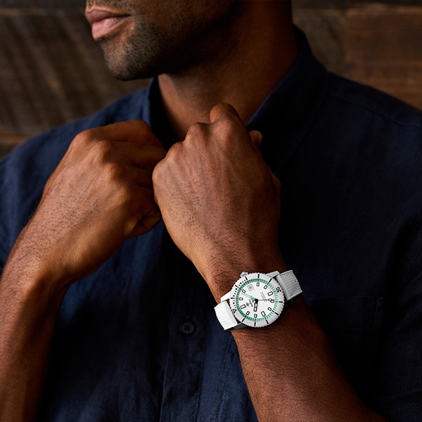 40mm径のケースにSTP 1-21自動巻きムーブメントを搭載したZodiacのCOMPRESSION DIVER IIウォッチ。マットホワイトのダイヤルに、ホワイトのラバーバンドを組み合わせました。