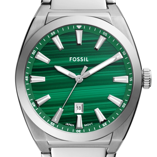 今シーズンのトレンドカラーを取り入れた、スポーティなスタイルのEVERETT。目を引くインデックスを配した天然マラカイトストーンのダイヤルと、ステンレススチール製H-linkブレスレットを組み合わせた、存在感抜群のモデルです。