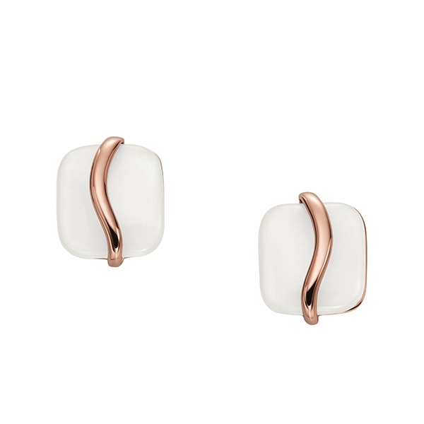 有機的なフォルムのホワイトシーグラスを使用したスタッドピアス。ローズトーンのステンレススチールが描く曲線的なデザインが特徴です。バタフライポストタイプ。
