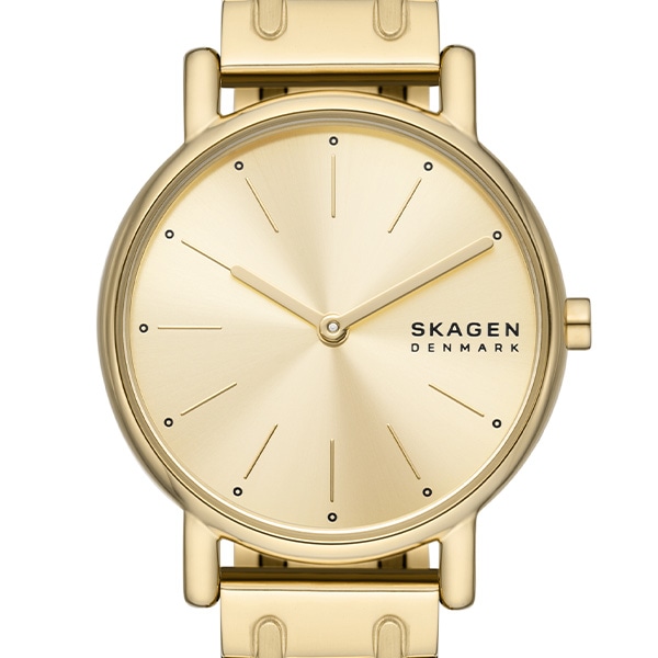 30mm径のケースに三針ムーブメントを搭載したSIGNATUR LILLE。ゴールドトーンのサンレイダイヤルに、ゴールドトーンのステンレススチール製ブレスレットを組み合わせました。ウォッチストラップは付け替え可能です。