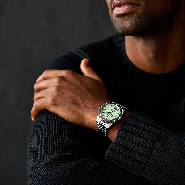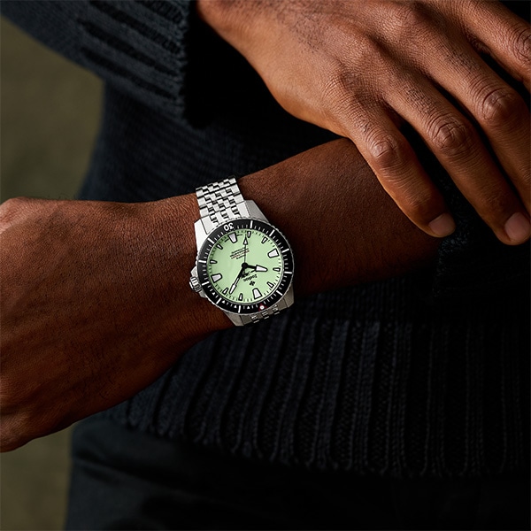 42mm径のケースにSTP 1-21自動巻きムーブメントを搭載したZodiacのPRO-DIVERウォッチ。スペアミントのダイヤルに、ステンレススチールブレスレットを組み合わせました。