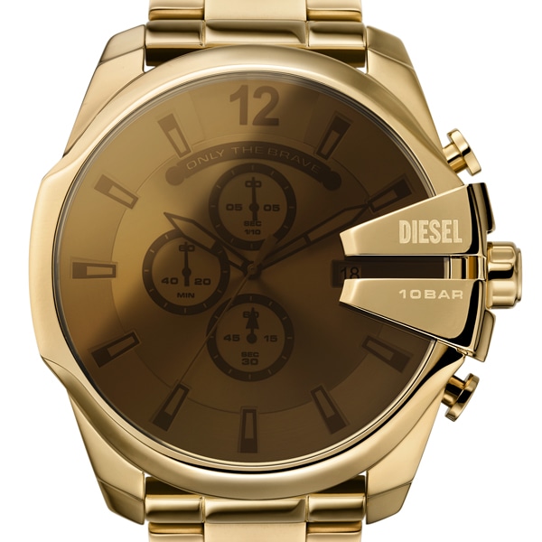 51mm径のケースにクロノグラフムーブメントを搭載したDieselのMEGA CHIEFウォッチ。ホワイトのサンレイダイヤルに、ゴールドトーンのステンレススチールブレスレットを組み合わせました。