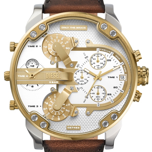 57mm径のケースにマルチタイムセッティングムーブメント機能を搭載した、DieselのMR. DADDY 2.0ウォッチ。シルバートーンの艶消しダイヤルに、ブラウンのレザーストラップを組み合わせました。