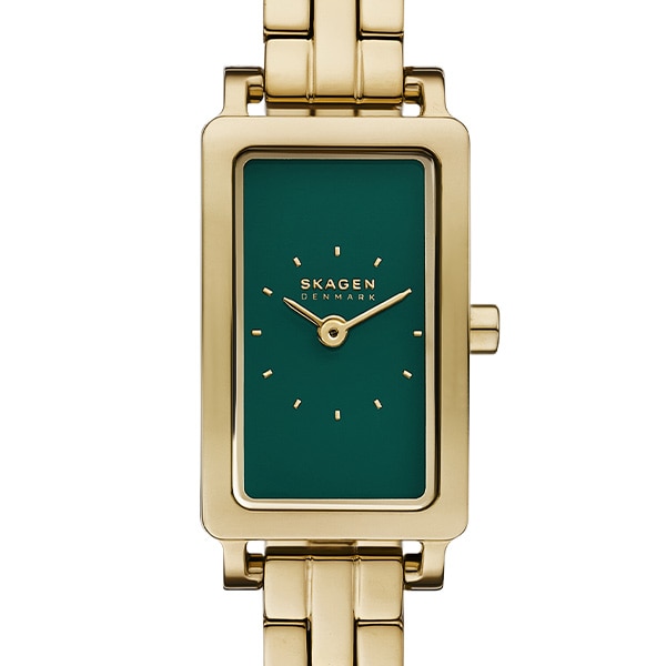 30mm径のケースに二針ムーブメントを搭載したHAGEN MICRO。光沢のあるグリーンのダイヤルに、ゴールドトーンのステンレススチールブレスレットを組み合わせました。