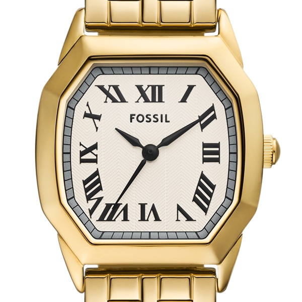 クラシックなアーカイブスタイルから着想を得て誕生したHARLOW。古くから愛されてきた洗練された魅力を再現したモデルです。繊細なゴールドトーンの艶出しステンレススチール製5連リンクブレスレットを備えたこのウォッチは、八角形のケース、質感のあるクリームカラーのダイヤル、三針ムーブメントが特徴です。