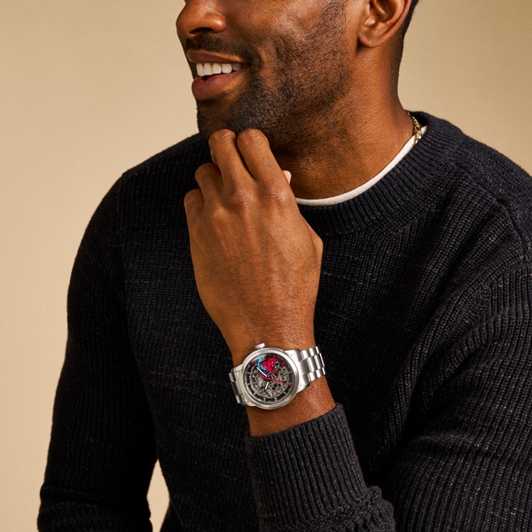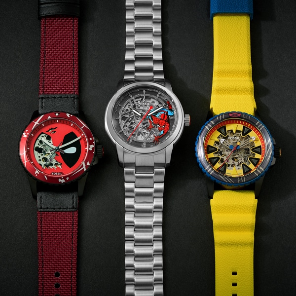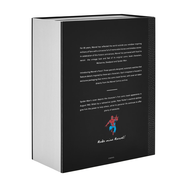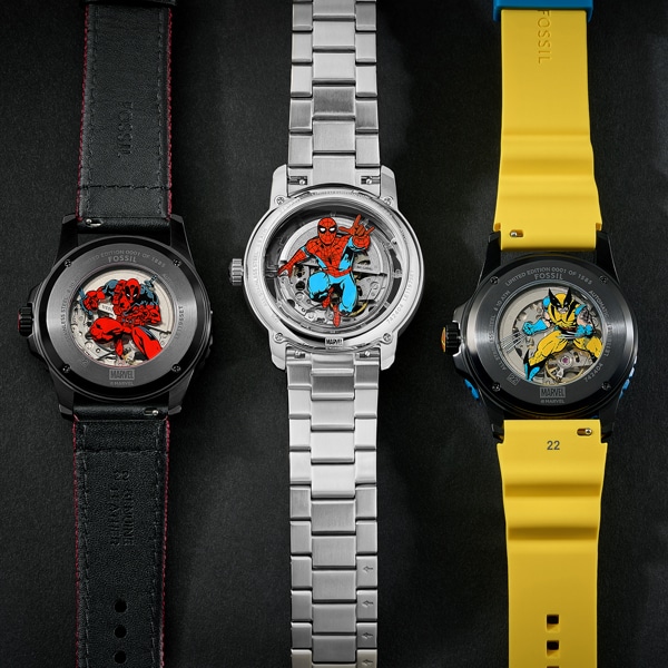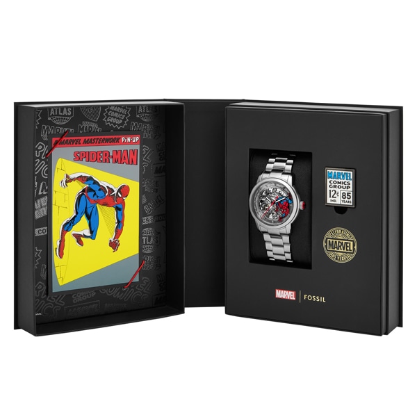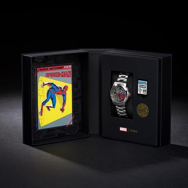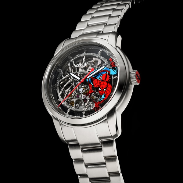この限定モデルの自動巻きウォッチは、マーベルで最も「重要な」キャラクターであるスパイダーマンから着想を得ています。内部機構が見えるステンレススチールのオープンワークダイヤルは、アイコニックなクモの巣のディテールが特徴。3連リンクブレスレットを組み合わせ、エキシビションケースバックにはキャラクターのアートをあしらいました。