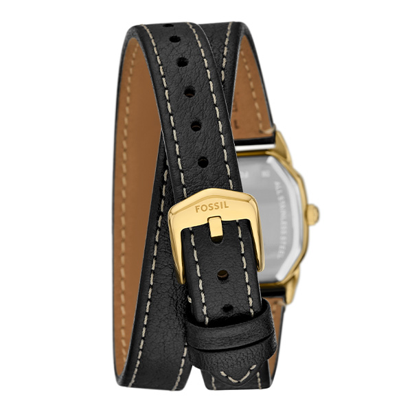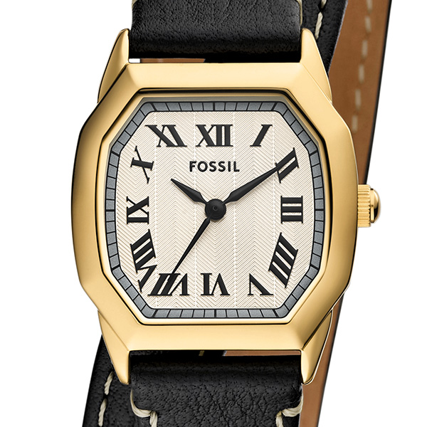 クラシックなアーカイブスタイルから着想を得て誕生したHARLOW。古くから愛されてきた洗練された魅力を再現したモデルです。このタイムレスなウォッチは、艶出し仕上げのゴールドトーンのステンレススチール製の八角形ケース、質感のあるクリームカラーのダイヤル、三針ムーブメント、ブラックのダブルラップレザーストラップが特徴です。Fossilのレザー製品は、Leather Working Group(LWG)を通じて責任あるものづくりを支援しています。