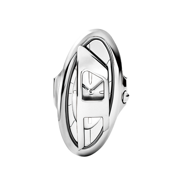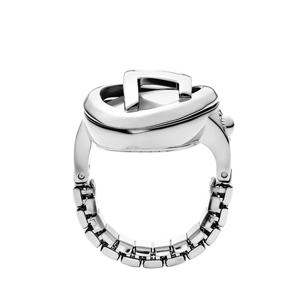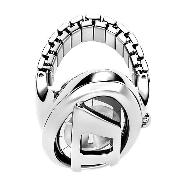 DIESELの19mm D-Eraリングウォッチ。シルバーのサンレイダイヤル、二針ムーブメント、伸ばすことができるステンレススチール製リングバンドアタッチメントが特徴です。