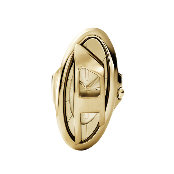 DIESELの19mm D-Eraリングウォッチ。ゴールドトーンのサンレイダイヤル、二針ムーブメント、伸ばすことができるゴールドトーンのステンレススチール製リングバンドアタッチメントが特徴です。