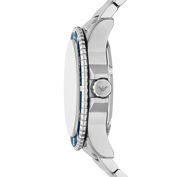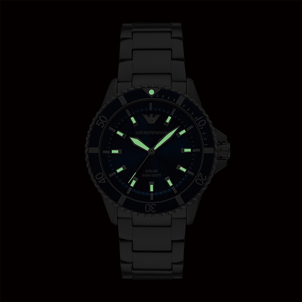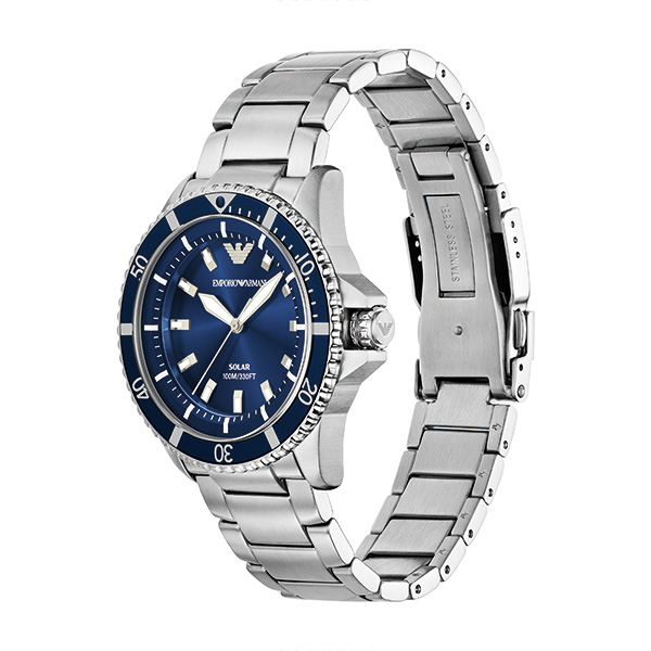 Emporio Armaniの42mm径 ワールドエクスプローラー ソーラーパワー 3針ウォッチ。ブルーのサンレイダイヤル、サファイアクリスタル、ステンレススチール製ブレスレットを組み合わせました。ソーラー駆動のムーブメントが信頼性を約束し、頻繁な電池交換を不要にします。この時計は1度のフル充電で最長4ヶ月間使用できます。