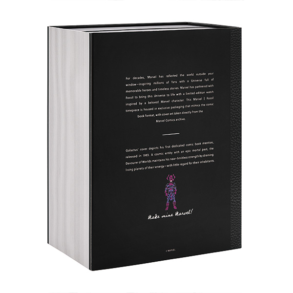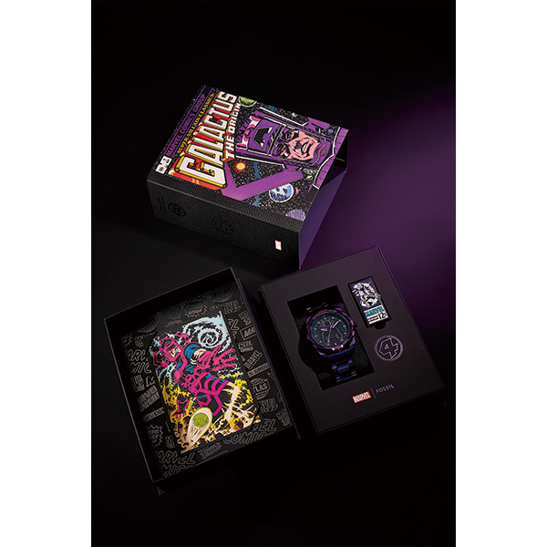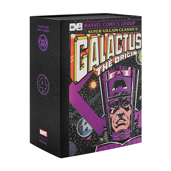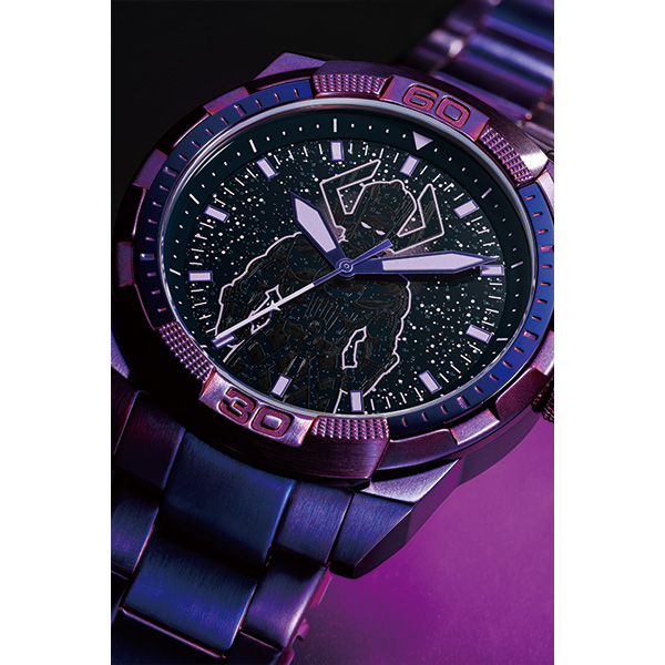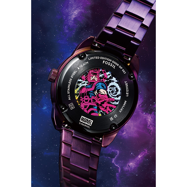 マーベルの世界で最大の悪役、ギャラクタスにふさわしい大迫力のウォッチをデザインしました。このコレクター垂涎の限定モデルは、光沢のあるパープルカラーの48mmの大型ステンレススチール製ケースとクォーツ三針ムーブメントを備えています。ダイヤルにはギャラクタスの光り輝くシルエットと星空のダイヤルが描かれ、カスタムケースバックはシリアルナンバー入りで、コミックアートワークが組み込まれています。