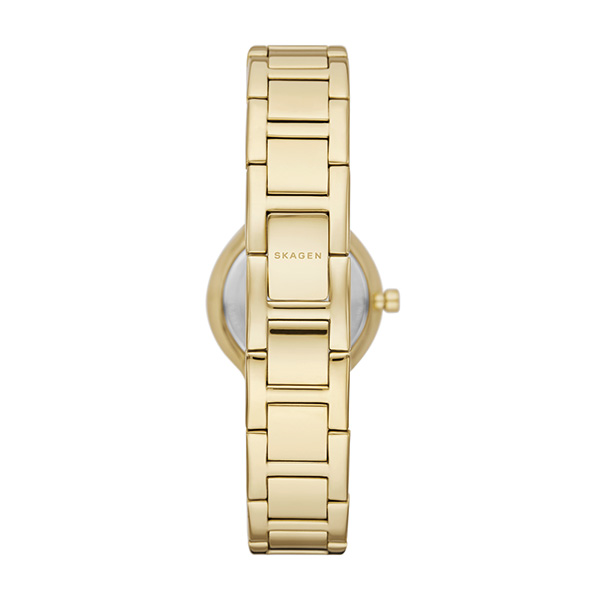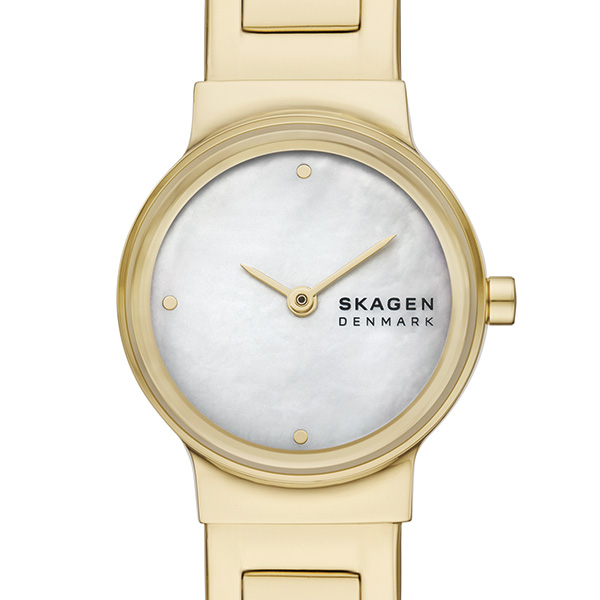 ゴールドトーンの小ぶりなラウンドケースに、お揃いのステンレススチール製ブレスレットをシームレスに組み合わせています。アイボリーのマザーオブパールダイヤルが、ミニマルなデザインに控えめなエレガンスを添えています。