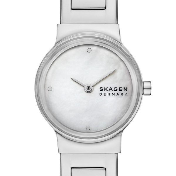 シルバートーンの小ぶりなラウンドケースに、お揃いのステンレススチール製ブレスレットをシームレスに組み合わせています。アイボリーのマザーオブパールダイヤルが、ミニマルなデザインに控えめなエレガンスを添えています。