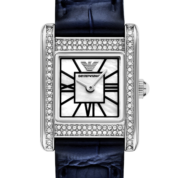 Emporio Armaniのケースサイズ20 x 26mmのウォッチ。ホワイトのマザーオブパールダイヤルにローマ数字インデックスを配し、ステンレススチール製ケースにクリスタルをあしらいました。ディープブルーのクロコダイル型押しレザーストラップが、お手持ちのコレクションを洗練された印象に仕上げます。
