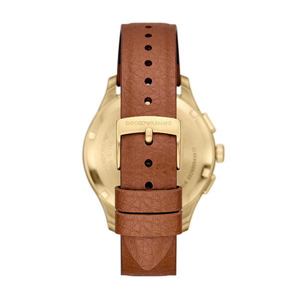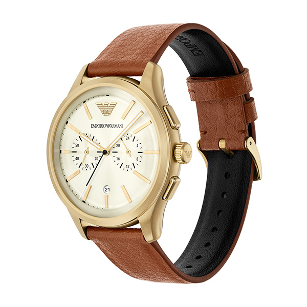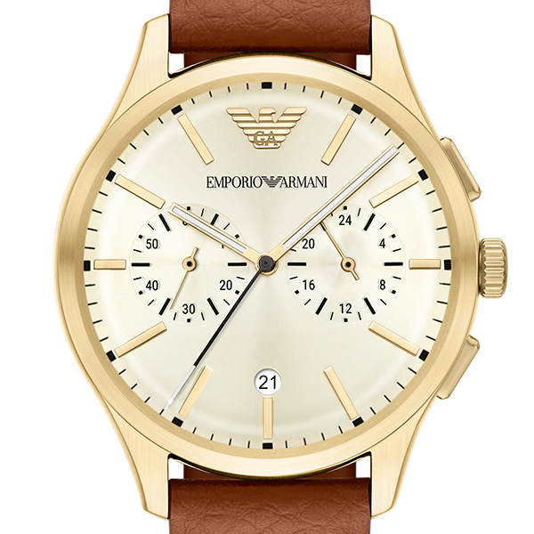 この 42mm クロノグラフ ウォッチは日本製ムーブメントを搭載し、革製のブラウン ストラップが付いています。2つのサブアイをクリームカラーのサンレイダイヤルに配し、ゴールドトーンのステンレススチール製ラウンドケースに収めた機能的なモデルです。