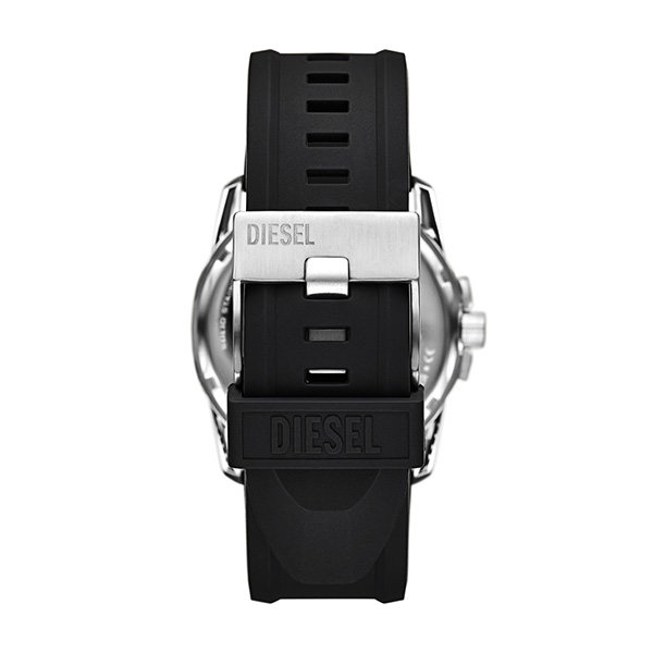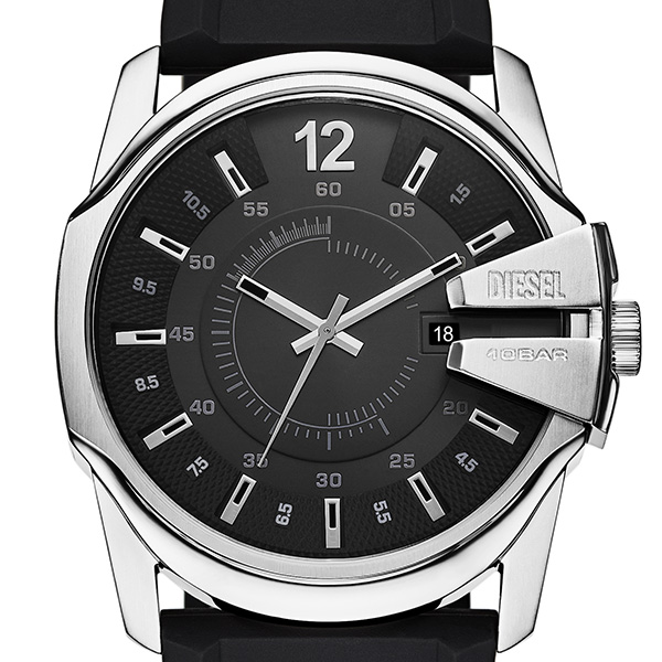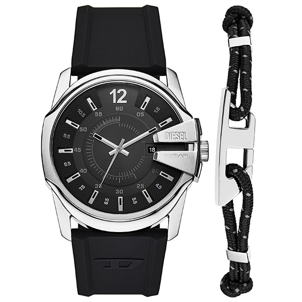 43mm径のケースに日付表示付き三針ムーブメントを搭載したDIESELのMASTER CHIEFウォッチ。ブラックのサンレイダイヤルと、コードステンレススチール製Dロゴブレスレットを組み合わせたブラックのシリコンストラップを備えています。