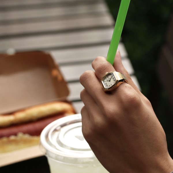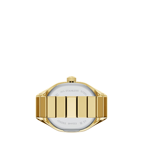 ジュエリーとタイムピースが融合したユニークなデザインのこのウォッチは、ゴールドトーンのステンレススチール製八角形ケースとブレスレットを備え、洗練されたまとまりのあるルックを実現しています。クリームカラーのマットテクスチャードダイヤルは、繊細な深みとコントラストを加え、ニ針機能でミニマルな魅力を表現しています。コンパクトなサイズでありながら、調節可能なクロージャで、パーソナルで快適なフィット感をもたらします。