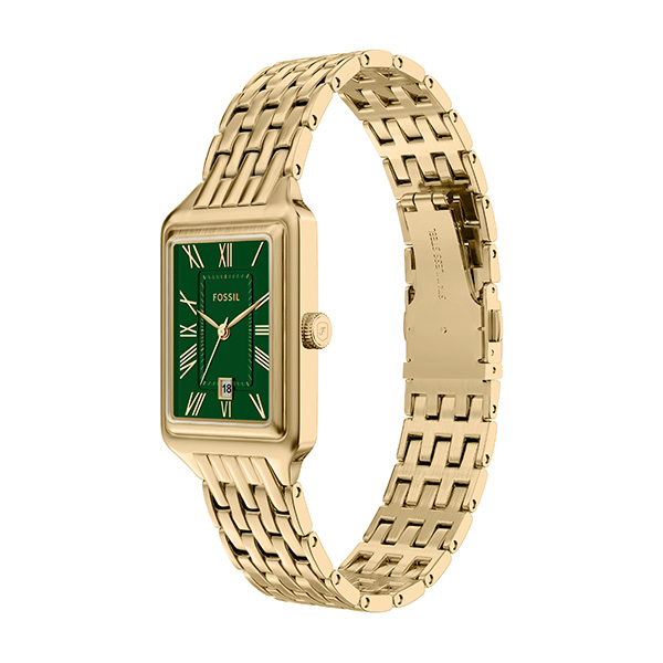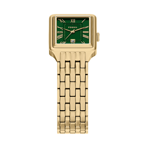 ゴールドトーンのステンレススチール製長方形ケースとマッチしたブレスレットが組み合わされ、洗練された統一感のあるデザインに仕上がっています。グリーンのサテンダイヤルは洗練されたポップカラーを添え、すっきりとした三針表示と便利な日付窓を備えています。ダブルプッシュ中折れクラスプを備えたこのウォッチは、考え抜かれたディテールと上質な素材が組み合わされ、洗練されたデイリーアクセサリーに仕上がっています。