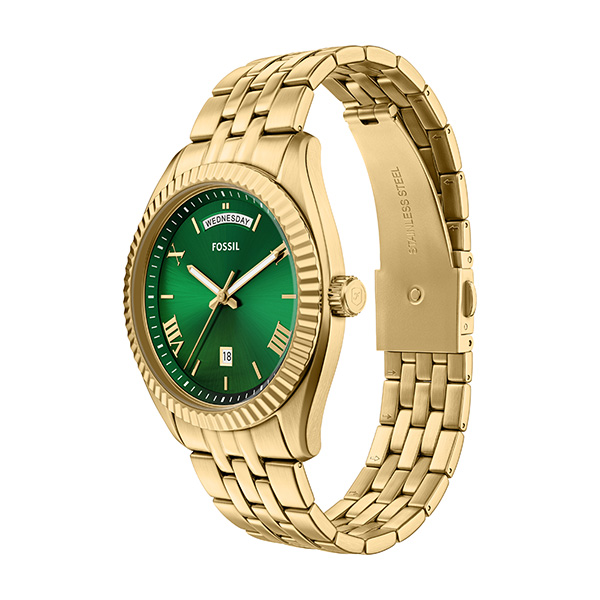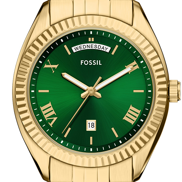 タイムレスな魅力をたたえ、モダンクラシックを体現するCAMPBELLウォッチ。フォルムと機能性の見事なバランスを実現しています。ゴールドトーンのステンレススチール製ケースには、リッチなグリーンのサンレイダイヤルが配され、曜日と日付のウィンドウがスケジュール管理をサポートします。洗練されたディテールで考え抜かれて作られたこのブレスレットウォッチは、洗練された素材とモダンな機能性のバランスが絶妙です。