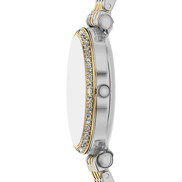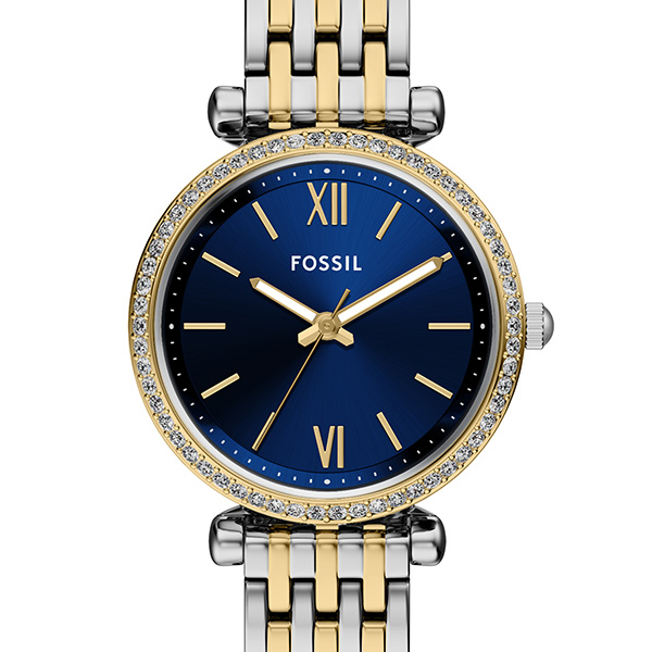 このツートーンウォッチは、ゴールドとシルバートーンのステンレススチール製マルチリンクブレスレットとコーディネートしやすいラウンドケースを組み合わせ、洗練されたデザインを表現しています。ブルーのサンレイダイヤルが鮮やかなコントラストを描き、三針レイアウトがすっきりとモダンな印象を与えます。プッシュボタン付きの中折れクラスプで、フィット感を調節できます。