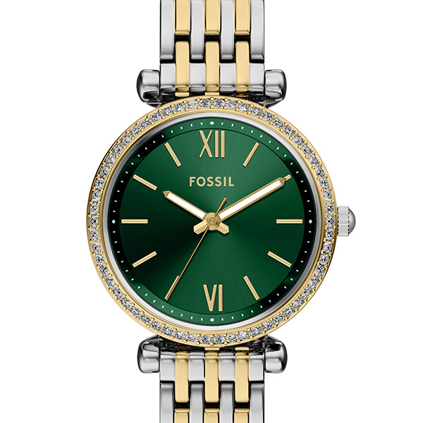 このツートーンウォッチは、ゴールドとシルバートーンのステンレススチール製マルチリンクブレスレットとコーディネートしやすいラウンドケースを組み合わせ、洗練されたデザインを表現しています。グリーンのサンレイダイヤルが鮮やかなコントラストを描き、三針レイアウトがすっきりとモダンな印象を与えます。プッシュボタン付きの中折れクラスプで、フィット感を調節できます。