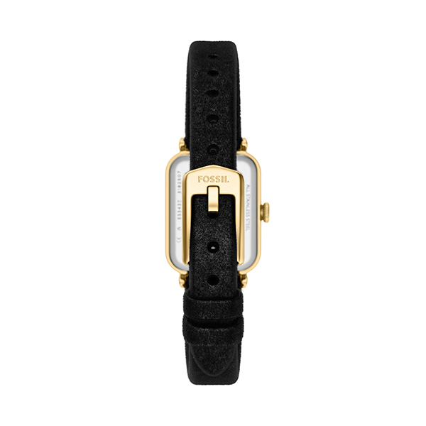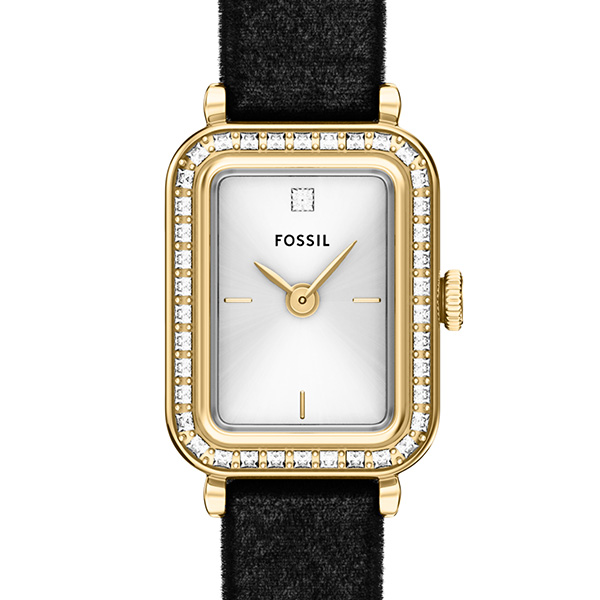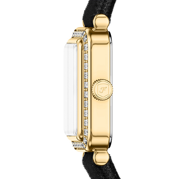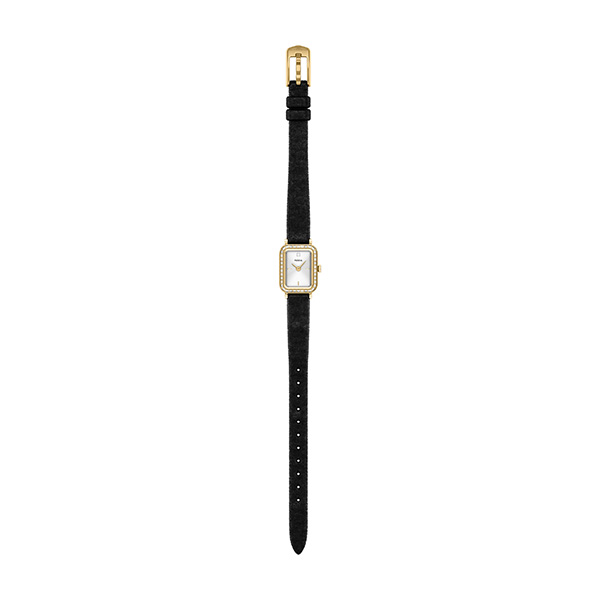 ゴールドトーンの長方形ケースとブラックのベルベットファブリックストラップの組み合わせが、すっきりと控えめな印象を与えます。シルバートーンのサンレイダイヤルが繊細な質感とコントラストを添え、ニ針ムーブメントを搭載することで洗練された計時を実現します。