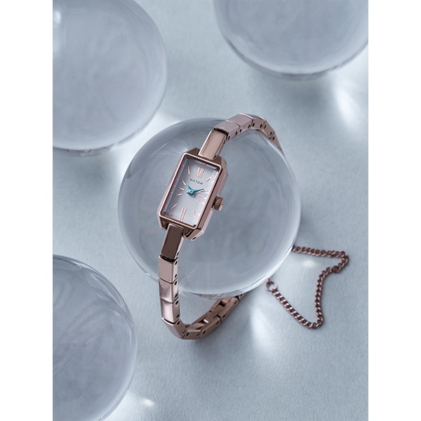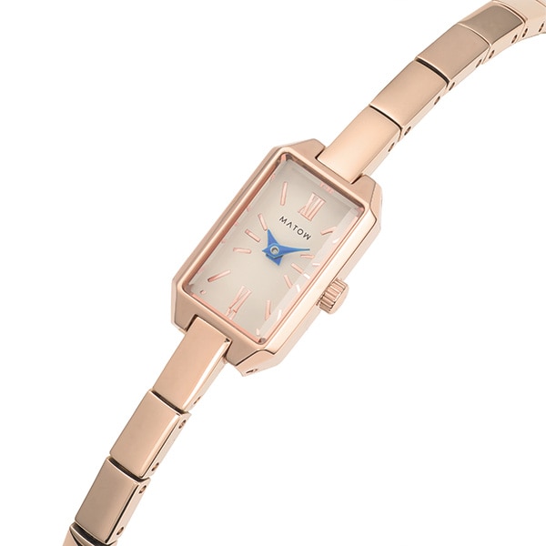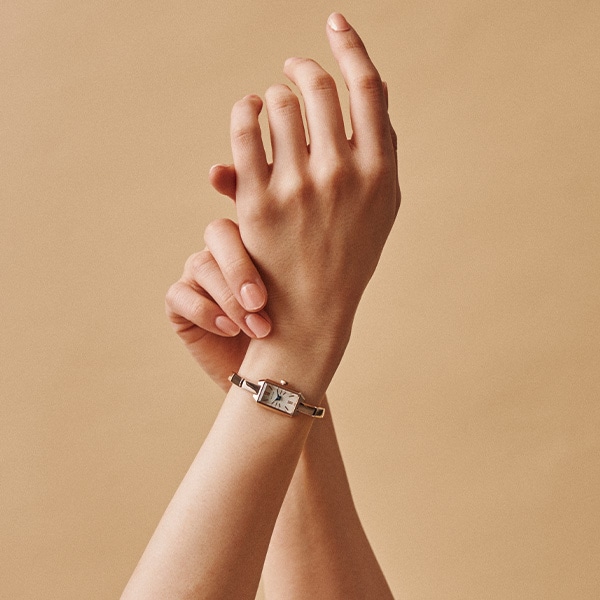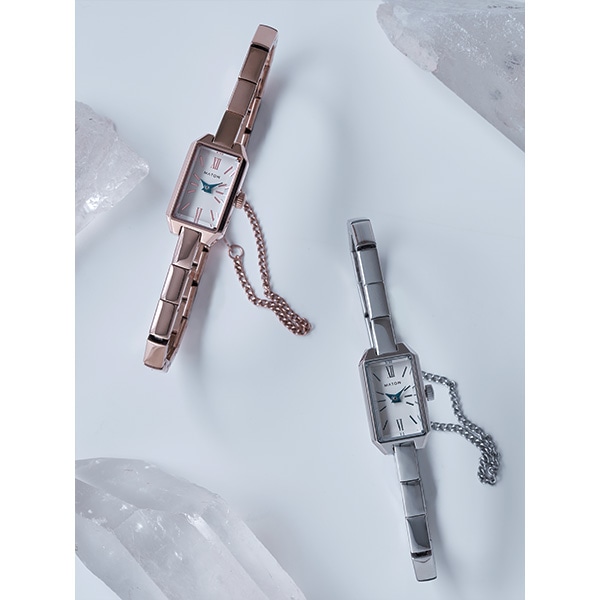 「清月 ミニスクエア」は、そんな静かに輝く月の情景を、時計のフォルムやディテールに落とし込みました。 細身のスクエアケースは、月が夜空に浮かぶ姿のように洗練され、無駄のないシルエット。文字盤の繊細なインデックスは、月光が水面に映るように柔らかな輝きを放ちます。また、青針のさりげないアクセントは、夜空の深い青を思わせる静謐な美しさを表現。細部までこだわり抜いた日本の職人技が、時を超えて愛される一本を生み出しました。 都会の喧騒から一歩離れ、自分だけの時間を静かに味わう大人の女性に寄り添う時計。移ろいゆく時間の美しさを、手元でそっと感じてください。