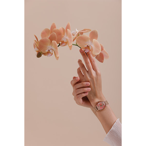 しとやかに春を告げる山桜。 幾重にも重なる花びらが、千年の都・京都の歴史のように静かに咲く。 ふとした瞬間に心を和らげる、上品な彩り。 「雅」ではなく「静けさ」で魅せる美しさを、腕元に。
