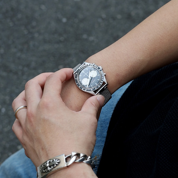 フォースナーとは、1920年頃にアメリカで創業したアクセサリーなどのチェーンメーカー。その代表作が39年に開発した長さ調整が自在にできる“コムフィット”というメッシュブレスです。フォースナー社は現在も様々なヴィンテージブレスを復刻し販売しており、今回アウトラインとのコラボレーションが実現、標準装備が可能となっています。