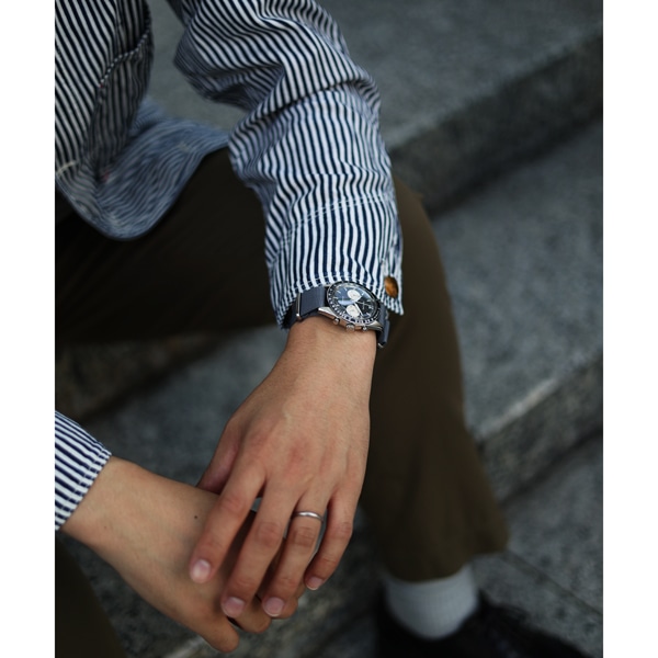 ケースのラグにバネ棒で装着するエンドピース部分が伸縮(写真下2点の左が通常の状態で右が縮めた状態)するため、19mmから22mmのラグ幅に対応しています。そのためこのサイズ内のラグ幅であれば、すでに所有しているほかの腕時計に装着して楽しむことも可能です。