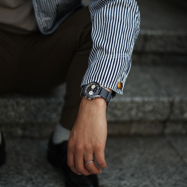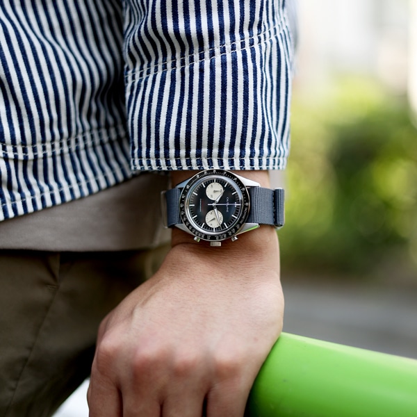 二つ目レトロ調メカクォーツクロノグラフ“2レジスタークロノ”のシリーズ第2作、その名も「シリーズ II 」。精悍なデザインもさることながら、1960年代にNASAの宇宙飛行士も着用したと言われる歴史的なJPチャンピオン型(コムフィット)ブレスを標準装備している点が大きな特徴です。