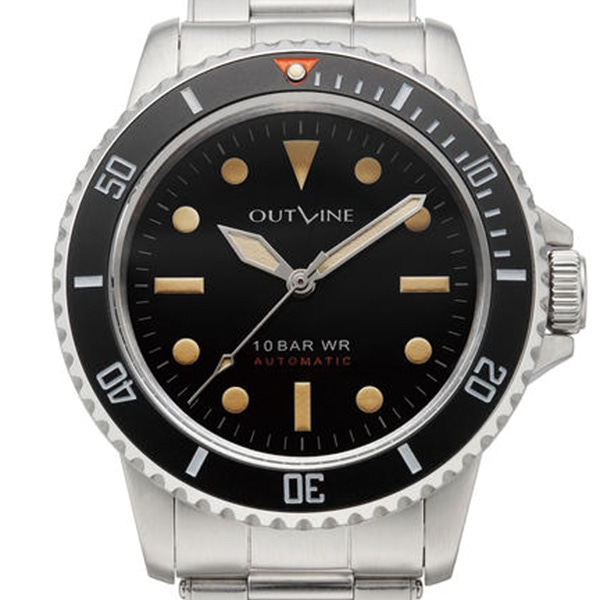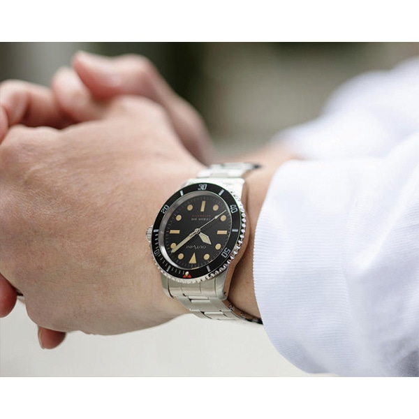 ムーヴメントにはセイコーエプソン製の機械式自動巻きムーヴメント、Cal.YN55Aを搭載。また時計のバリエーションは各ベゼルともにインデックス違いで2種類を用意しました。ドットとバーを組み合わせた往年のスタンダードタイプと、一部に3・6・9を使用した軍用のサブマリーナータイプです。もちろん1950年代のものを復刻したアウトラインオリジナルのリベットブレスがセットされており、レトロ感がぐっと際立った魅力的な作りとなっております。