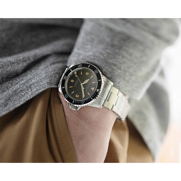 1960年代の往年のダイバーズウオッチをモチーフに、ダイバーズウオッチの王道ともいえるスタイルを表現。艶のないしっとりとしたブラックに仕上げているためより落ち着いた雰囲気が楽しめます。このモデルは軍用サブマリーナーで知られる369アラビアインデックスタイプです。