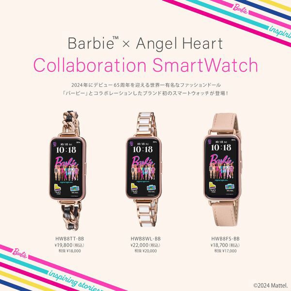 エンジェルハート初となるスマートウォッチが登場!2024年に65周年を迎えるBarbieとコラボレーションし、エンジェルハート×Barbieのオリジナル文字盤をリリースします。*文字盤はタップでランダムに全5種類変化します。Angel Heartで不動の人気を誇る肌なじみの良いピンクベージュレザーベルトに取り外し可能な4種のアクセサリーをオン。気分やコーディネートに合わせてお楽しみください。