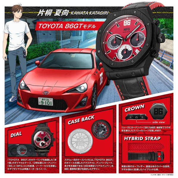 片桐夏向とトヨタ86GTの世界観を、カラーリングやサブダイヤルで表現。「86」を12時位置に配したした主人公の片桐夏向モデル。トヨタ86GTのメーターをデザインソースにしたサブダイヤル。12時位置とクラウンにカーナンバーを配置。裏蓋にホイールとナンバープレートをデザイン。が特徴です。