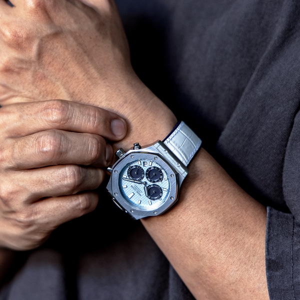 アイコニックなオクタゴンケースには、縦方向に伸びる美しいヘアラインを施し、ベゼルには8つのヘキサゴン鋲を用いることで、上品なムードを高めたデザインが魅力です。タフでありながらも、エッジを効かせたケースとベルトに一体感を持たせることで、スタイリッシュさを打ち出した仕上げになっています。