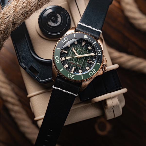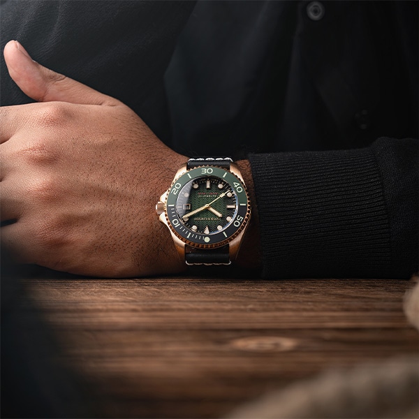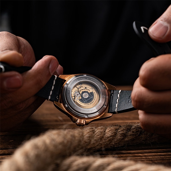 Tesei コレクションはブロンズやチタンなど、海洋工学分野で使用される高性能素材を使用した海洋工学の世界からインスピレーションを得たシリーズです。ケースに使用されたブロンズ素材は酸化する事で経年変化が発生し、まるで時計を育てている様な楽しみも感じられます。