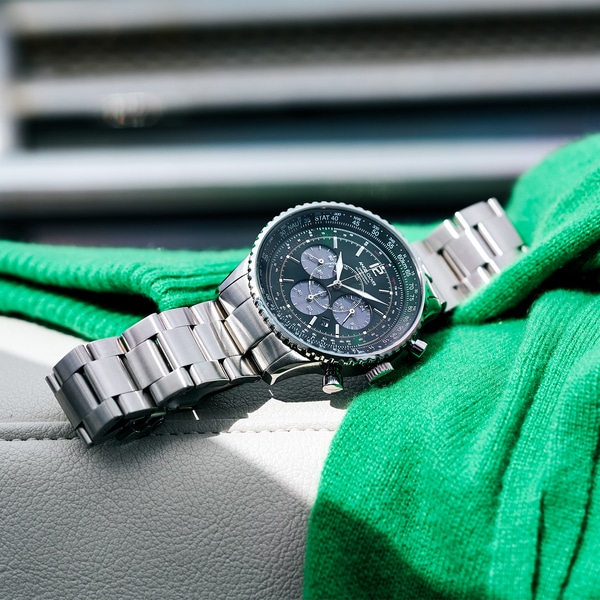 クロノグラフ60分計、1/5秒計、24時間表示を搭載し、さらに計器としてさまざまな意味を持つ目盛りが記された、ベゼル&ダイヤルは繊細かつ大胆。経過時刻の積算や速度の算出など、飛行に必要なあらゆる計算が可能な高い機能性を備えた、パイロットウォッチならではの精悍なルックスに心踊らされます。 力強いインパクトのあるクラシカルなデザインに加え、モデル名にもある太陽光のフル蓄電で6か月間駆動といった、ストレスを感じることなく使うことができる実用的なタイムピースです。