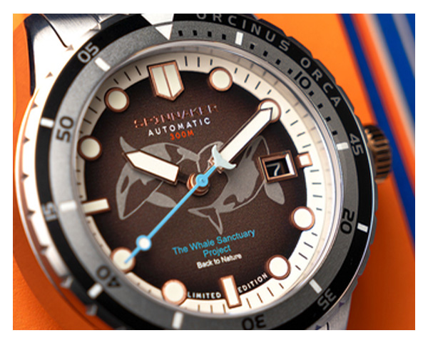 ブラックからダークブラウンのグラデーションがクラシカルな雰囲気のあるダイヤルには、2頭のオルカ(シャチ)が軽やかに泳ぐ様が大胆に配されてます。