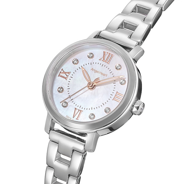 時間を読み取りやすいよう、60メモリ付き。インデックスにはクリスタルを8石施し、お手元の動きに合わせて煌めきます。