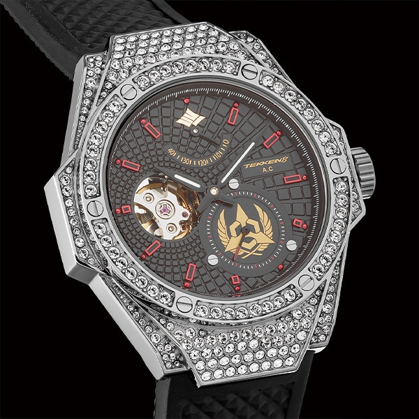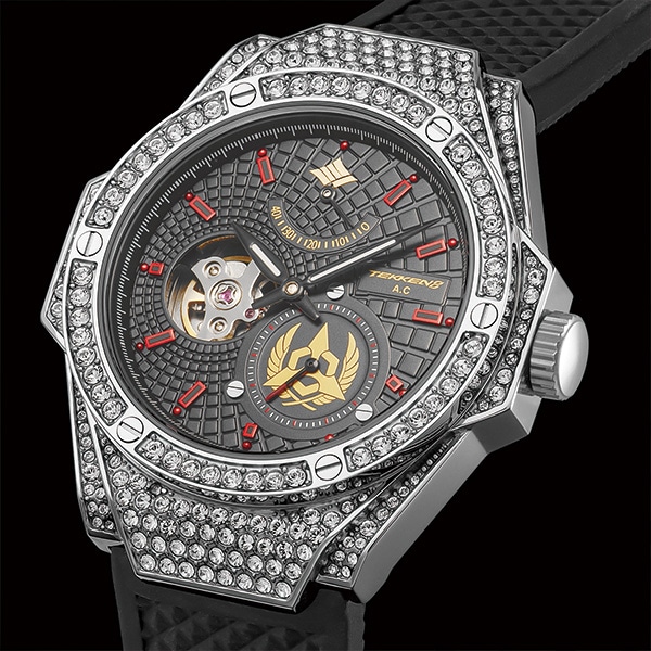 12時位置は拳を象った紋。5・6時位置のスモールセコンドには三島財閥のロゴをデザイン。ケース全体にクリスタルガラスを236石、埋め込み、強さを表現。裏蓋には雷神拳のコマンドをデザイン。細部まで楽しめる逸品です。