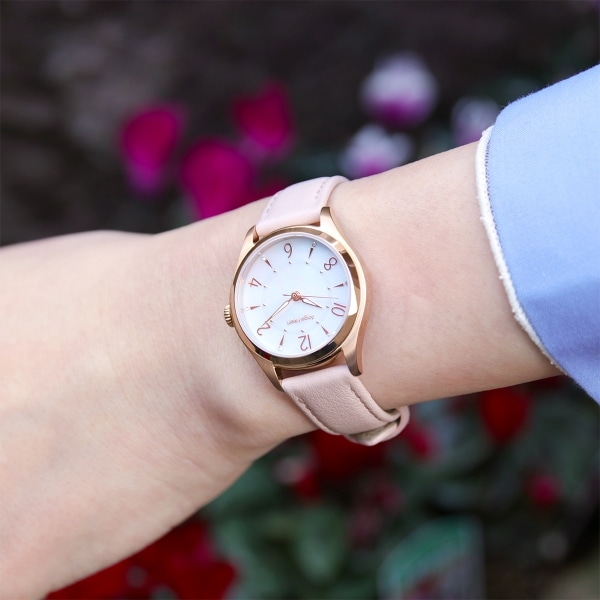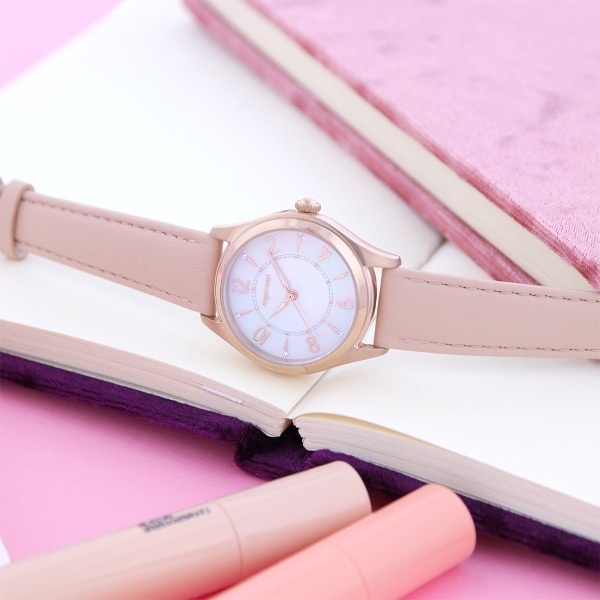 チックタック別注モデル。シーズンレスなオンオフ問わず使用しやすいデザインで初めての腕時計にもおすすめ。スタッズやクリスタルを採用した大小さまざまなインデックスによってシンプルかつ程よい洒落感を演出。オンオフ問わず着用できる1本。別注モデルはピンクゴールドケースに淡いペールピンクのレザーストラップを合わせました。甘くなり過ぎずないフェミニンなデザインです。