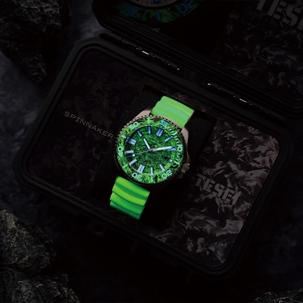 300M防水のルミナスカーボン×ダイバーズウォッチ。ダイヤル、ベゼル、ストラップが蓄光する、斬新なカーボンモデル。ダイヤルとベゼルにはルミナスカーボンを使用。ラバーベルトも蓄光。ダイバーズ仕様とルミナス仕様が絶妙なバランスで構成された、次世代アナログウォッチの登場です。