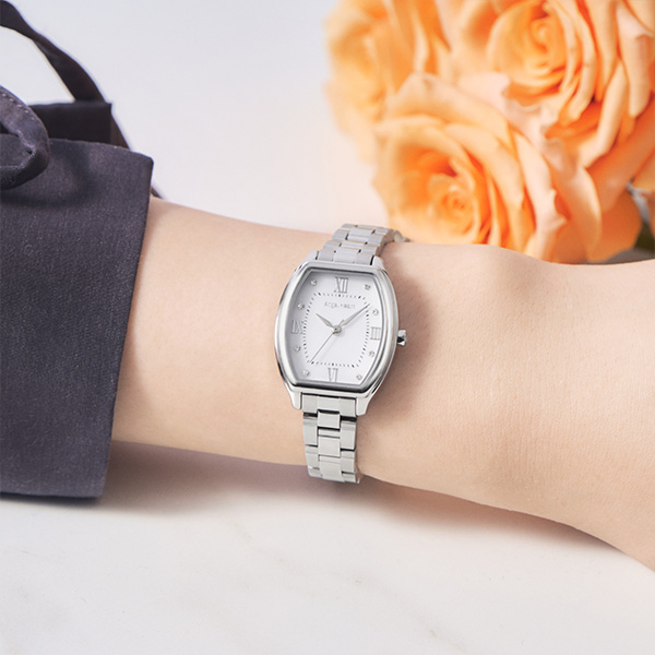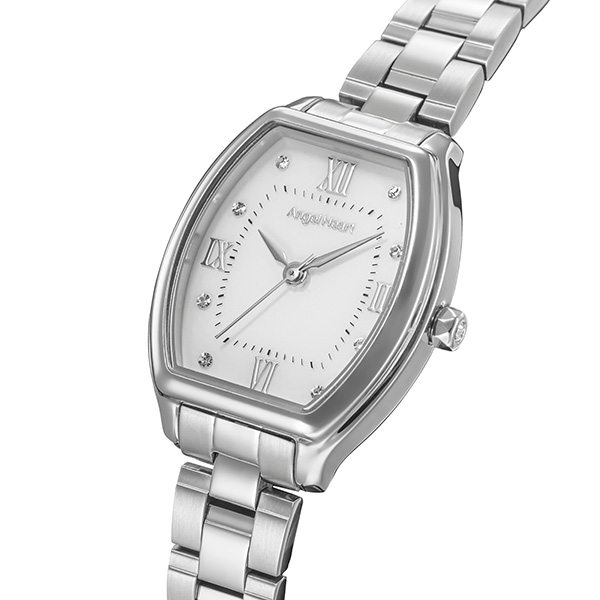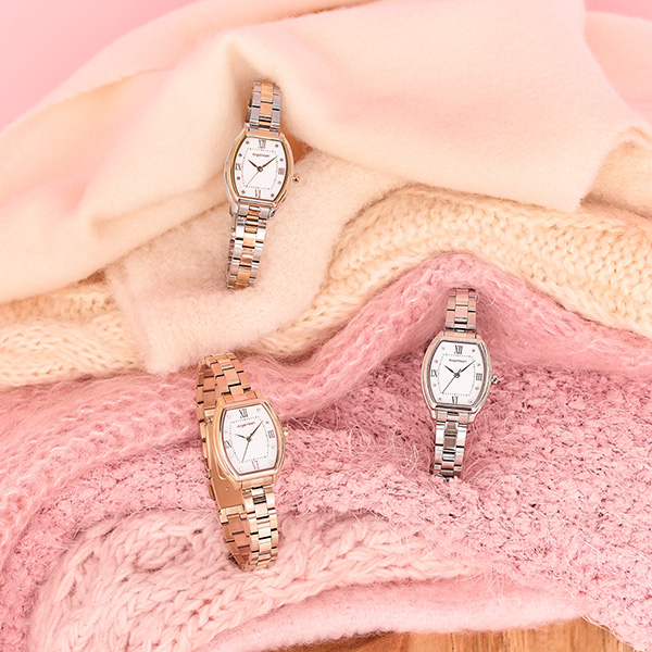 お求めいただきやすいエントリーライン初のトノー型ウォッチが登場。プレシャスゴールド/コンビ/シルバーの3色展開。シンプルなホワイトにローマ数字をあしらったタイムレスなデザインに、8石のクリスタルを施し、エンジェルハートらしい可愛さをプラス。ブレスにはマットとポリッシュ仕上げをコンビネーションさせ、腕もとを美しく引き立てます。60メモリ付きで視認性にも優れています。